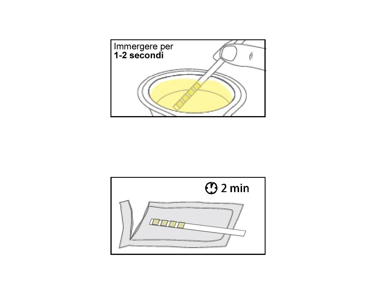Attenzione: premere la striscia e assicurarsi che tutti e quattro i campi del test siano immersi per circa 1-2 secondi.